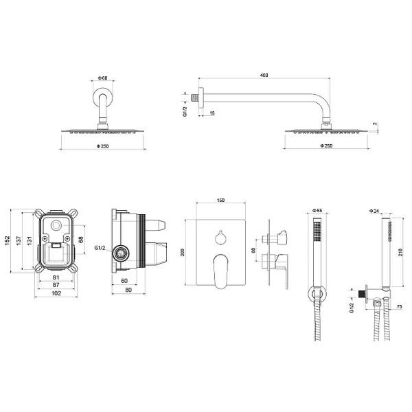 Материал корпуса - латунь на 2 потребителя картридж sedal 35 мм (испания) душевая колонна из нерж. φ23 мм верхний душ из нерж. 250*250*2 мм ручной душ из латуни 1 функц. шланг для душа из нерж 1,5 м преключатель - керамический дивертор упакован в цветн. коробку со вставками из пены пвх