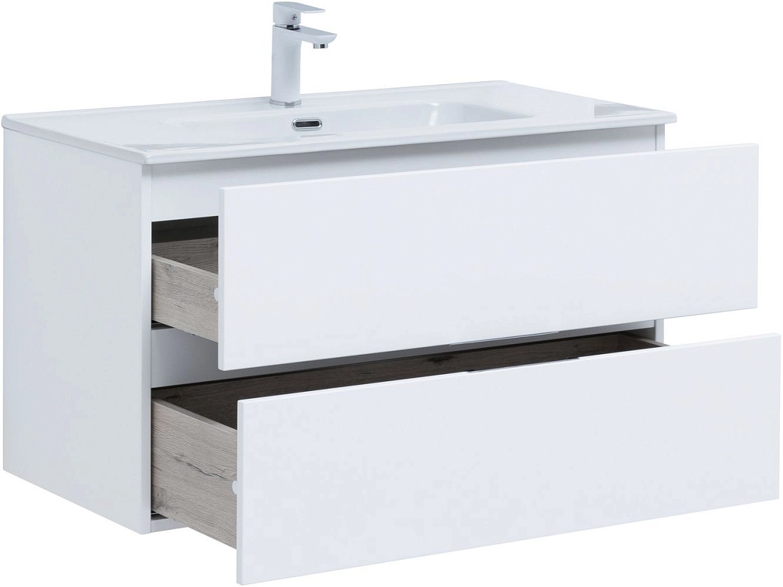 Сверху устанавливается прямоугольная раковина Aquanet Flat 90, изготовленная из керамики. Материал экологичный, гипоаллергенный и легко очищается от грязи неабразивными чистящими средствами.