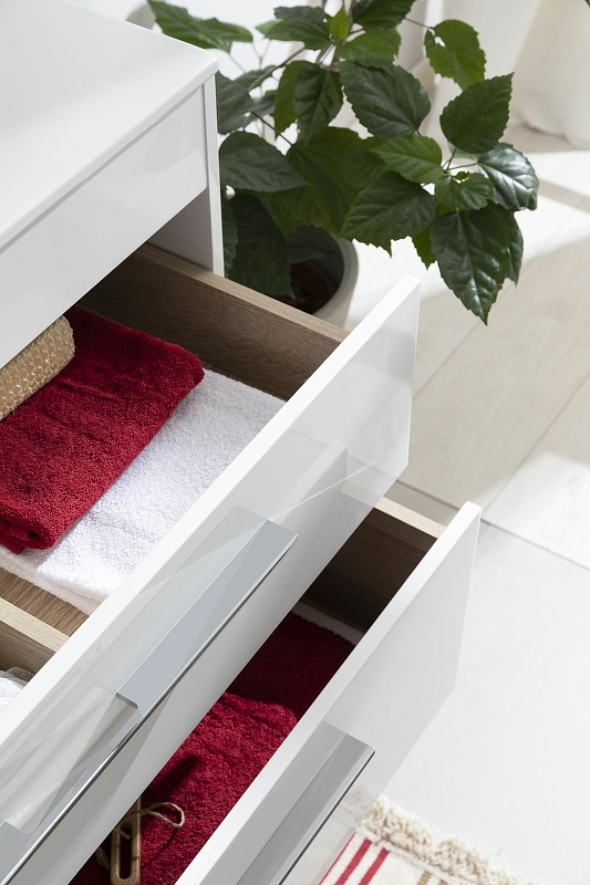 Тумба под раковину заинтересует приверженцев классических белых оттенков в интерьере ванной комнаты. Оснащена двумя выдвижными ящиками. В модели используются направляющие, которые работают по принципу шарикоподшипников. Они обеспечивают тихое и плавное скольжение, точность направления, исключает перекашивания ящиков даже при их полном выдвижении.