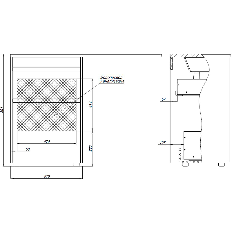 - Габариты корпуса тумбы (ШхВхГ): 570х891х475.