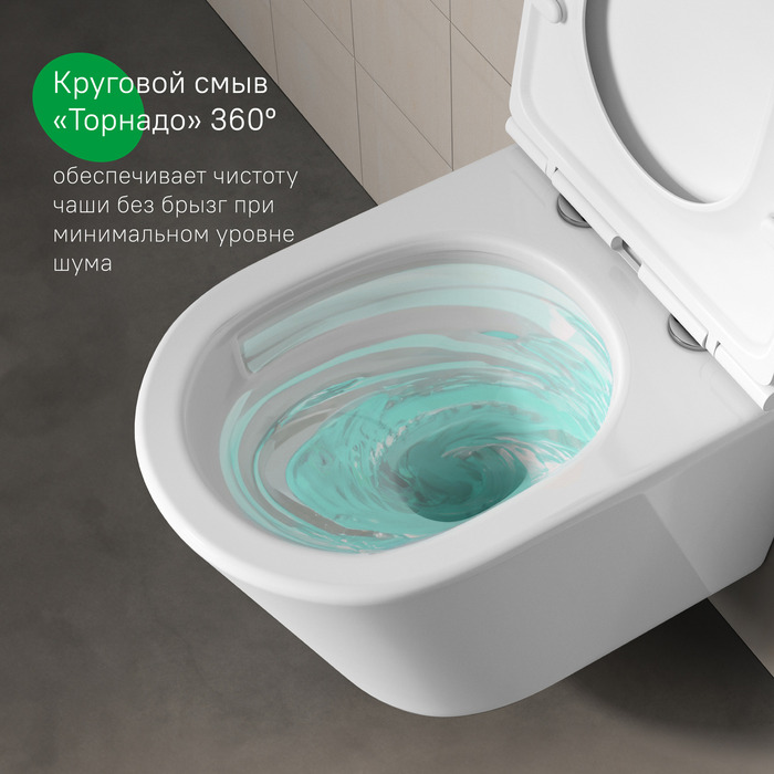 – Одна из самых эффективных систем смыва: струя воды из отверстия в чаше создает эффект водоворота, полностью очищая всю внутреннюю поверхность унитаза.